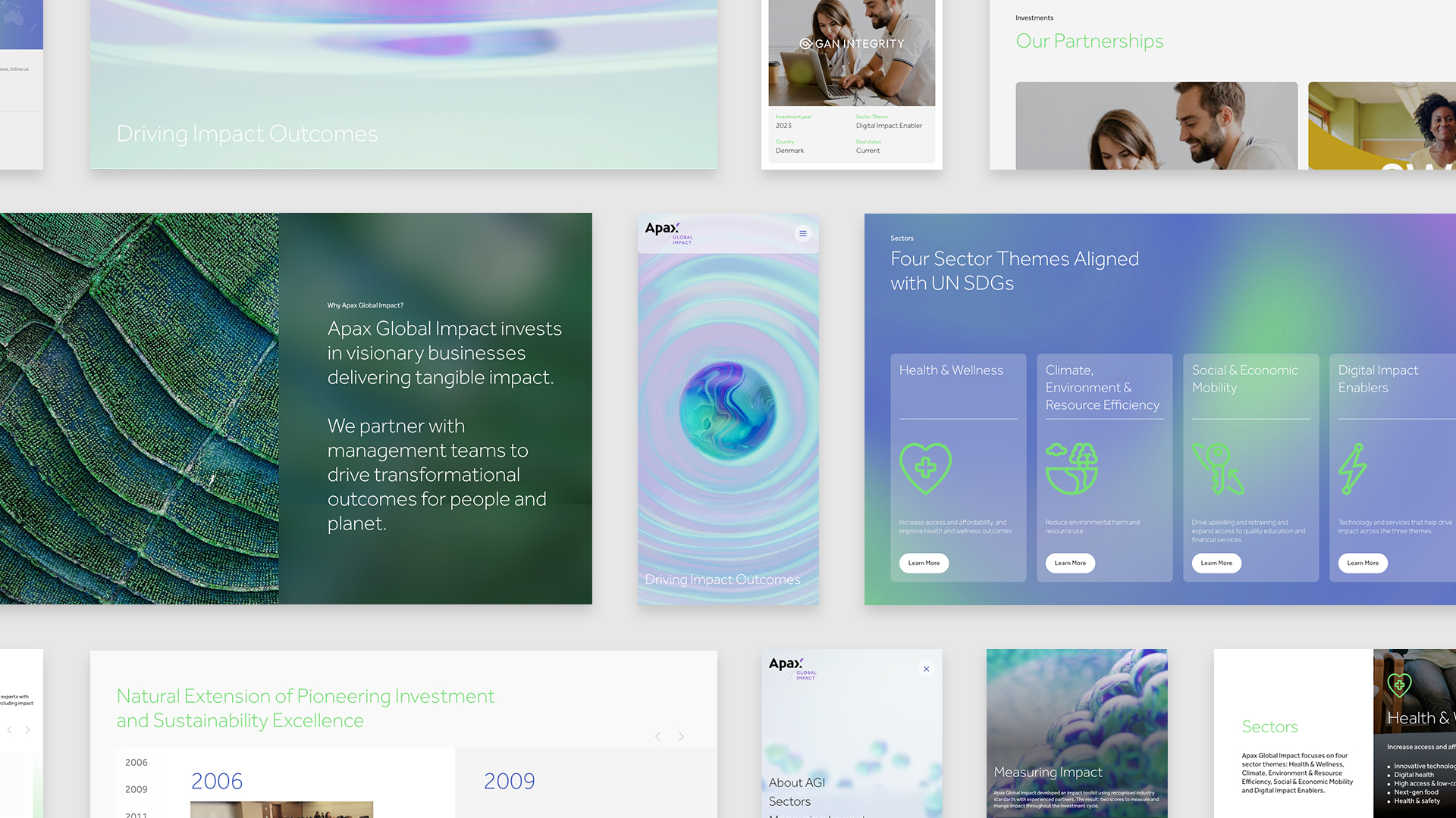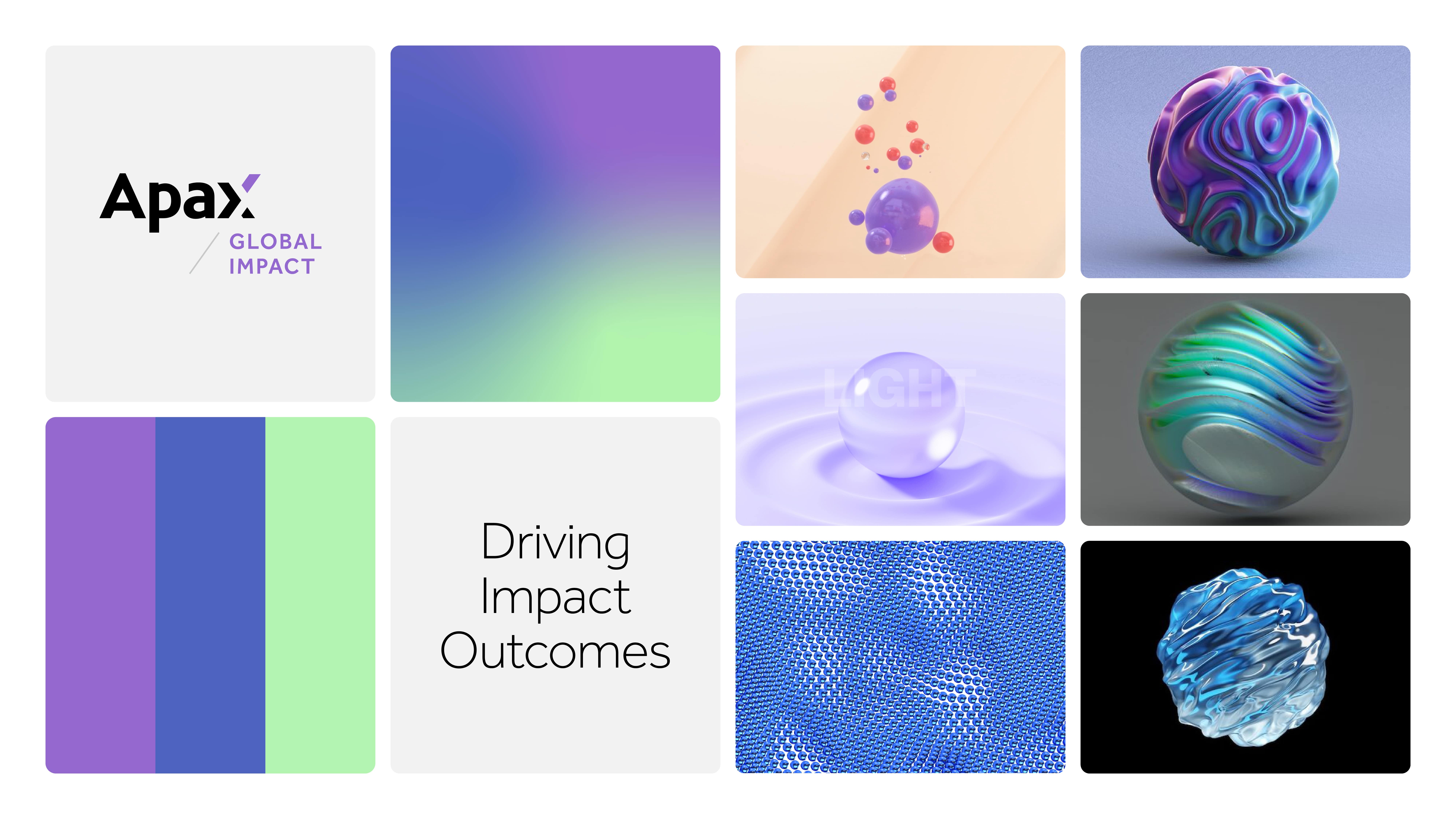 Leveraging our distinctive visual concept from the main Apax website we propelled this further with a new brand visual and animation to capture Global Impact's distinctive message. Now taking on it's own unique form to represent the catalyst for positive change.