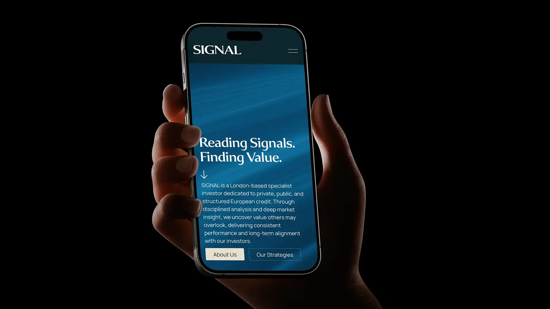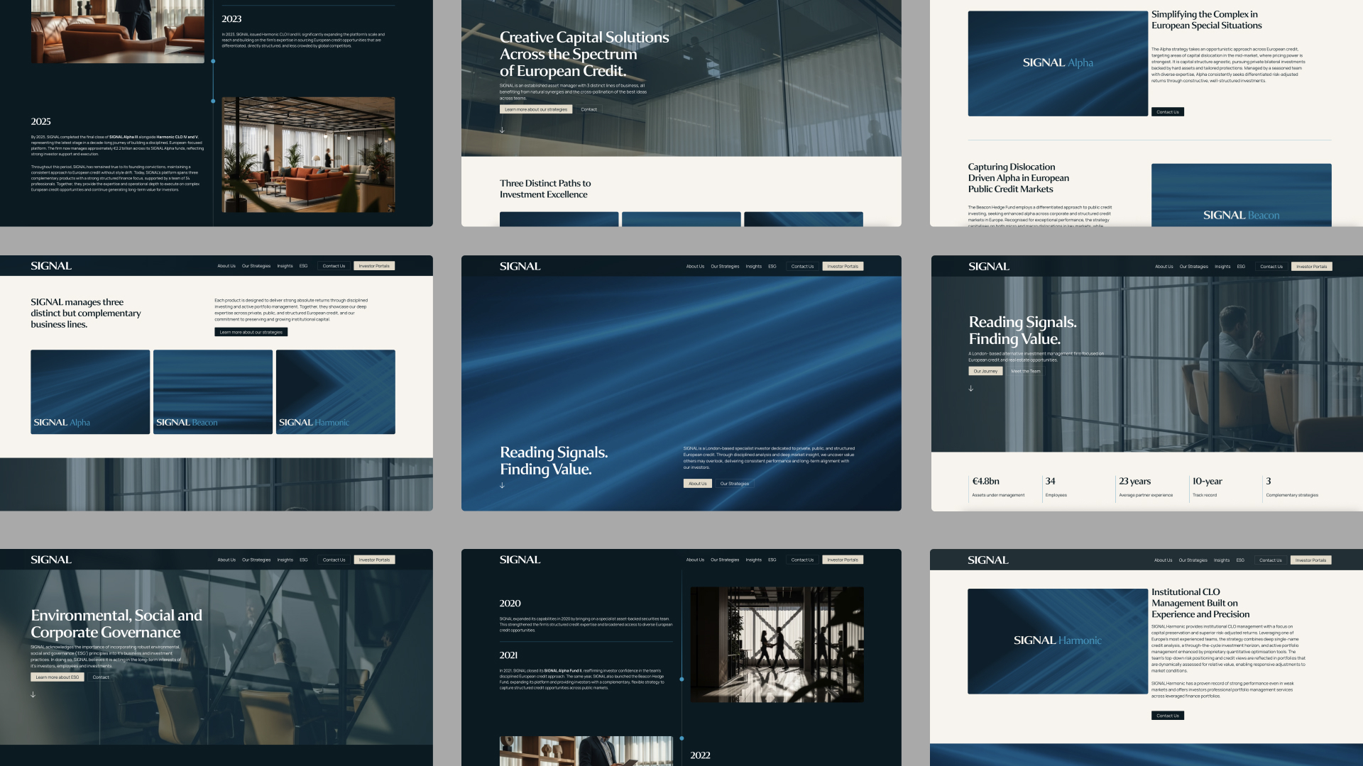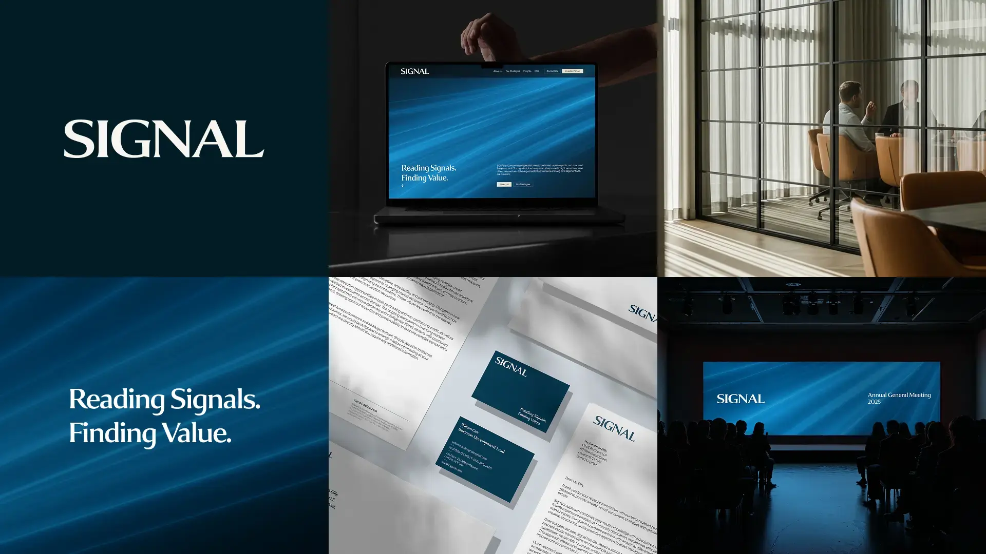 Our work began with a strategic foundation: clarifying SIGNAL’s positioning, tone of voice, and key messaging so the brand could better express its expertise and forward-thinking investment approach. From this, we developed the new tagline — “Reading Signals. Finding Value.” — a concise expression of the firm’s analytical strength and ability to uncover opportunity in complex situations. With the strategy in place, we moved into a full identity refresh, creating a more authoritative visual system that included a new crafted logo wordmark and comprehensive brand guidelines to ensure consistency across all communications.