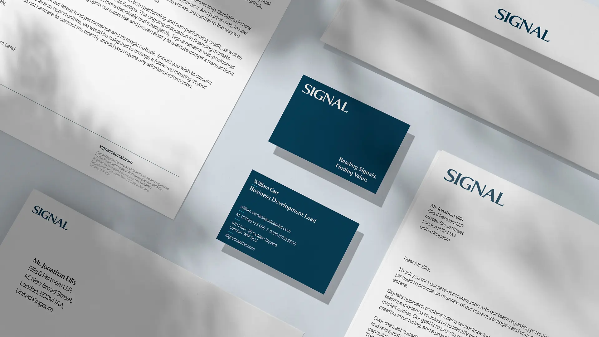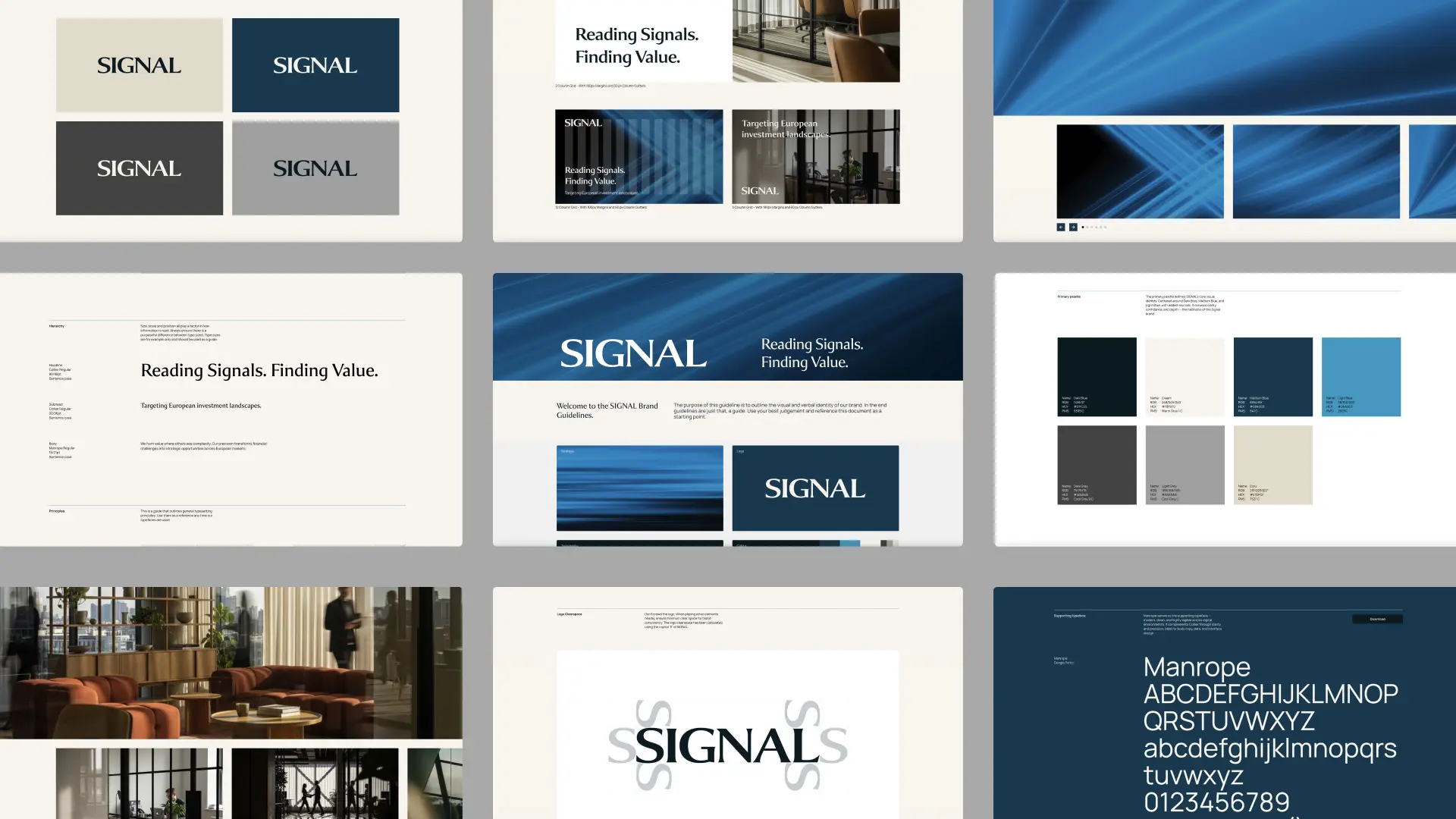 Our work began with a strategic foundation: clarifying SIGNAL’s positioning, tone of voice, and key messaging so the brand could better express its expertise and forward-thinking investment approach. From this, we developed the new tagline — “Reading Signals. Finding Value.” — a concise expression of the firm’s analytical strength and ability to uncover opportunity in complex situations. With the strategy in place, we moved into a full identity refresh, creating a more authoritative visual system that included a new crafted logo wordmark and comprehensive brand guidelines to ensure consistency across all communications.